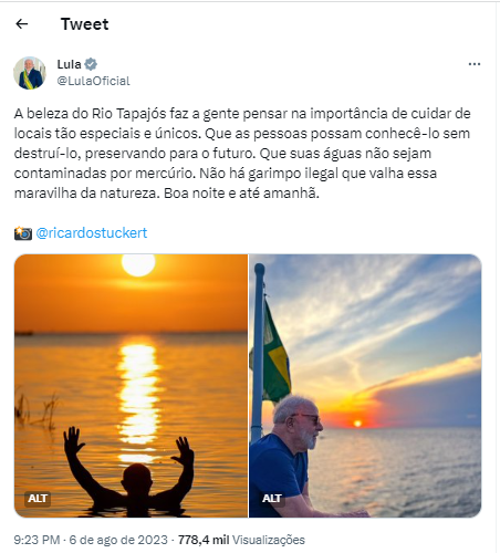 “O pôr do sol no Rio Tapajós, na Amazônia, é mais que beleza. E força, resistência e esperança”. (Lula, desfrutando das belezas do rio Tapajós em Santarém)