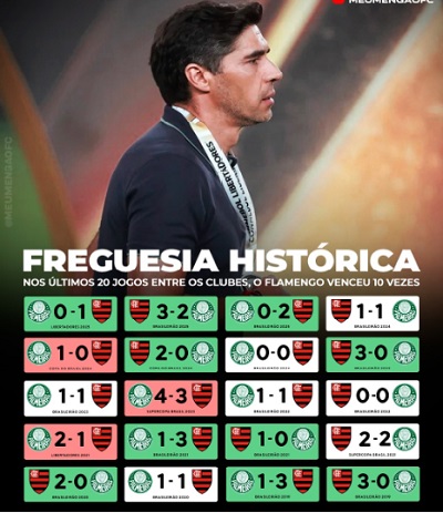 No Brasileirão, o domínio é ainda mais impressionante: o Palmeiras não vence o Flamengo desde 2017. São 16 partidas desde então, com 8 vitórias rubro-negras e 8 empates.
