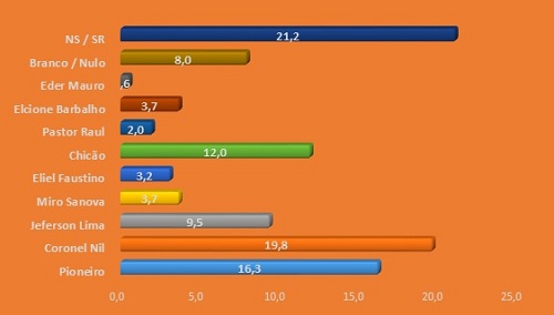 Quanto à pergunta estimulada, onde são apresentados os nomes dos candidatos, o Coronel Neil permanece em primeiro lugar com 25,1%, seguido por Pioneiro com 18,9%. O terceiro colocado é o deputado estadual Chicão com 14,0%. O radialista Jeferson Lima continua em quarto lugar com 9,7%.