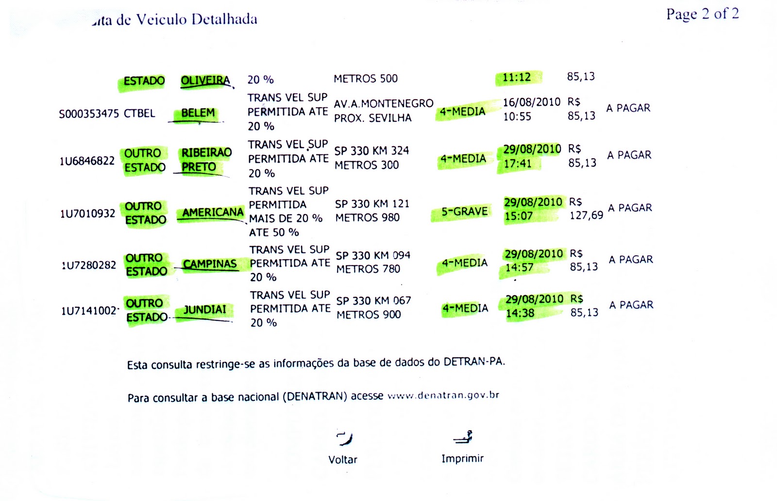 A consulta detalhada (ver imagens abaixo) mostra que somente este ano, são ao todo sete infrações, de naipes e preferências a escolher.