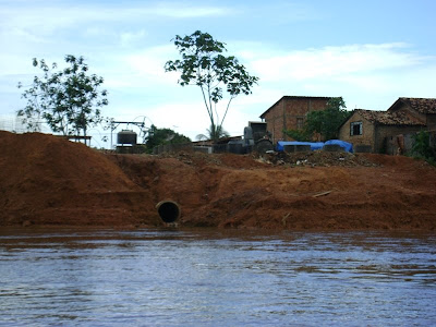 Três moradores do Cabelo Seco levaram o poster a percorrer  a extensão da obra, a pé e numa lancha, para verificar  a qualidade inconfiável dos serviços. No trecho do aterro que á para o Itacaiúnas, parte da tubulação de drenagem foi arrancada (foto acima).  Pior: os moradores garantem que os tubos de concreto  cobertos pelo aterro não receberam  como base de sustentação, o que eles chamam de “cama de concreto”, onde deveria ser assentada a tubulação.