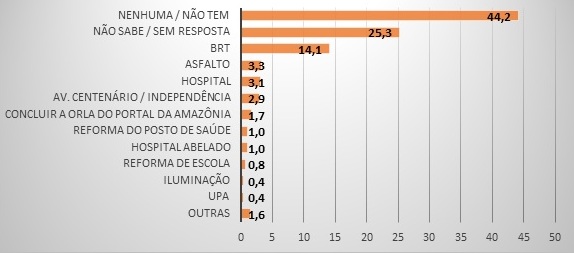 O governo de Zenaldo é um governo com pouca visibilidade em termos de obras e serviços. É o que mostra a pesquisa na variável “indique as principais obras/serviços realizados por Zenaldo em Belém”. Mais de 69% não indicaram nenhum serviço ou disseram que não tem nada mesmo. O que aparece é apenas “BRT”, “asfalto”, “hospital”, “Av. Centenário”.