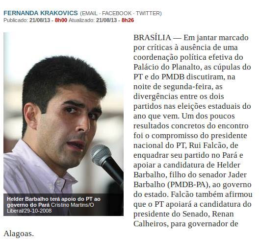 22 de agosto de 2013 - 11:31Apoiar uma candidatura de cabeça de chapa do PMDB no estado do Pará, com o histórico de quem está a frente dele é retornar a um passado de corrupção que ainda hj trás consequências nefastas ao Pará.
