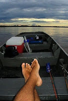 Fisgando poesia Pés em descanso sobre o banco da lancha. Pescaria em tempo de inverno é assim: sol e crepúsculo se abraçam, pausadamente, chamando a noite. Ao longe, beiradas de ribanceiras.
