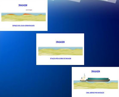 No infográfico acima, três etapas simuladas: 1) definição dos locais de derrocagem; 2) situação após as obras; 3) calado do canal liberado para navegação.