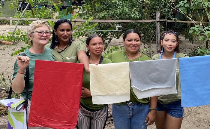 A técnica de confecção é minuciosa. As artesãs banham fios de algodão no látex colorido de forma manual. “É como se estivesse encerando uma linha de pipa. Você passa o látex, espera secar e repete o processo em várias camadas”, explica a artesã Suelen Belém. O resultado são fios emborrachados únicos, que também servem de base para biomateriais usados em tecidos de mochilas e mobiliário, exportados para marcas nacionais e internacionais.