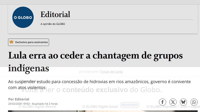 Ao priorizar o lucro das tradings de grãos em detrimento da autonomia dos povos da floresta, O Globo demonstra que sua visão de desenvolvimento parou no século XX.