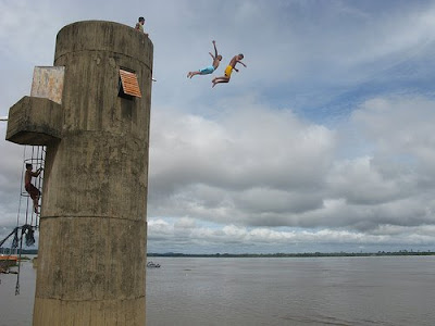 Saltando do reservatório primário da Cosanpa às margens do rio, cada emoção tem rápida trajetória, entre o pulo e o tibum final.