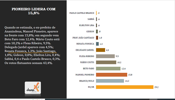 Nessa medição da Doxa, Pioneiro leva vantagem, aparecendo com 15,8% das intenções de voto, seguido pelo candidato do PT, Beto Faro que vem com 12,4%. Depois vem Mário Couto com 10,2%.