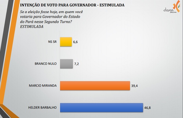 Helder Barbalho (MDB) obteve 46,8% das intenções de voto; Márcio Miranda (DEM) ficou com 39,4%. Indecisos somam 6,6%; e os que pretendem votar branco ou anular o voto são 7,2%.