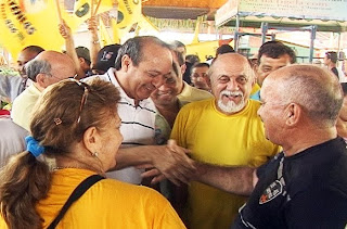 Na feira do bairro das Laranjeiras, Tião Miranda pedindo votos pra Simão Jatene.